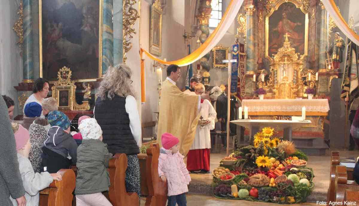 Am Sonntag wurde in Wald das Erntedankfest gefeiert. Pfarrer Ralf Heidenreich, der Priesteramtspraktikant Klaus Schülein und die Ministranten zogen in das mit einem Erntealtar geschmückte Gotteshaus ein. Der Gottesdienst in der Pfarrkirche St. Laurentius begann mit einem Begrüßungslied der Kindergartenkinder vom Haus für Kinder Wald, begleitet von der Leiterin Birgit Hierl mit der Gitarre, „Wir feiern heut ein Fest“. Der Projektchor Kirchenmusik Wald unter der Leitung von Thomas Schön und die Kindergartenkinder sangen abwechselnd.