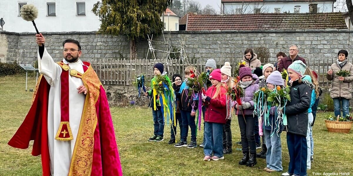 Mit dem Palmsonntag beginnt die Karwoche, auch „stille Woche“ genannt, in der an das Leiden und Sterben Jesu am Kreuz gedacht wird. Wenn auch der „Palmator“ am Adlersberg viel mehr Besucher anzog, kamen dennoch etliche Gläubige sowie die Kommunionkinder mit ihren Eltern zum Pfarrhof Zell, um dort bei der Segnung der Palmbuschen dabei zu sein. Pfarrer Tinu Nedumbakaran und Pastoralreferent Thomas Probst hießen dazu alle willkommen.
